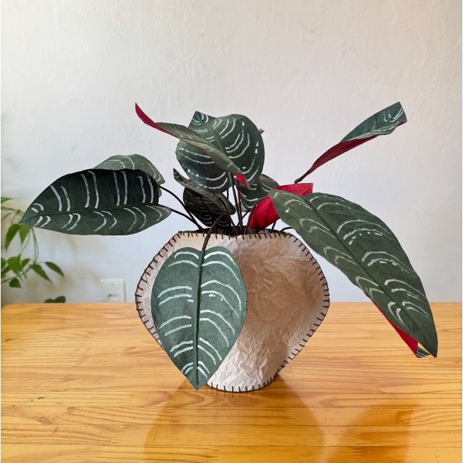 O vaso é feito em papel com a técnica crumpled paper, que valoriza a textura amassada e orgânica do material. Costurado à mão, ele envolve uma lata reutilizada, transformando o que seria descarte em um novo começo cheio de beleza.