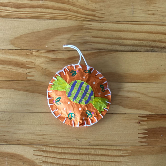 Os enfeites natalinos artesanais são feitos à mão em papel colorido, com textura amassadinha e costura manual que abraça cada peça com delicadeza. As ilustrações — balas, botinha, raminho e boneco de neve — trazem cores e alegria suave, criando um conjunto afetivo que ilumina qualquer cantinho.