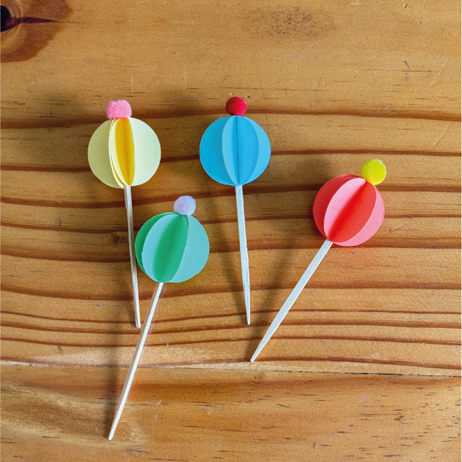 Nosso Topo Decorativo Balão Paper é feito à mão com papel colorido e pompons de lã, trazendo um toque alegre e artesanal para sua mesa.