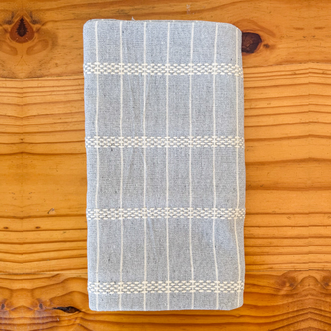Essa toalha é produzida em tecelagem artesanal, com fios em tom cinza e detalhes em cru que formam um padrão delicado e rústico ao mesmo tempo.